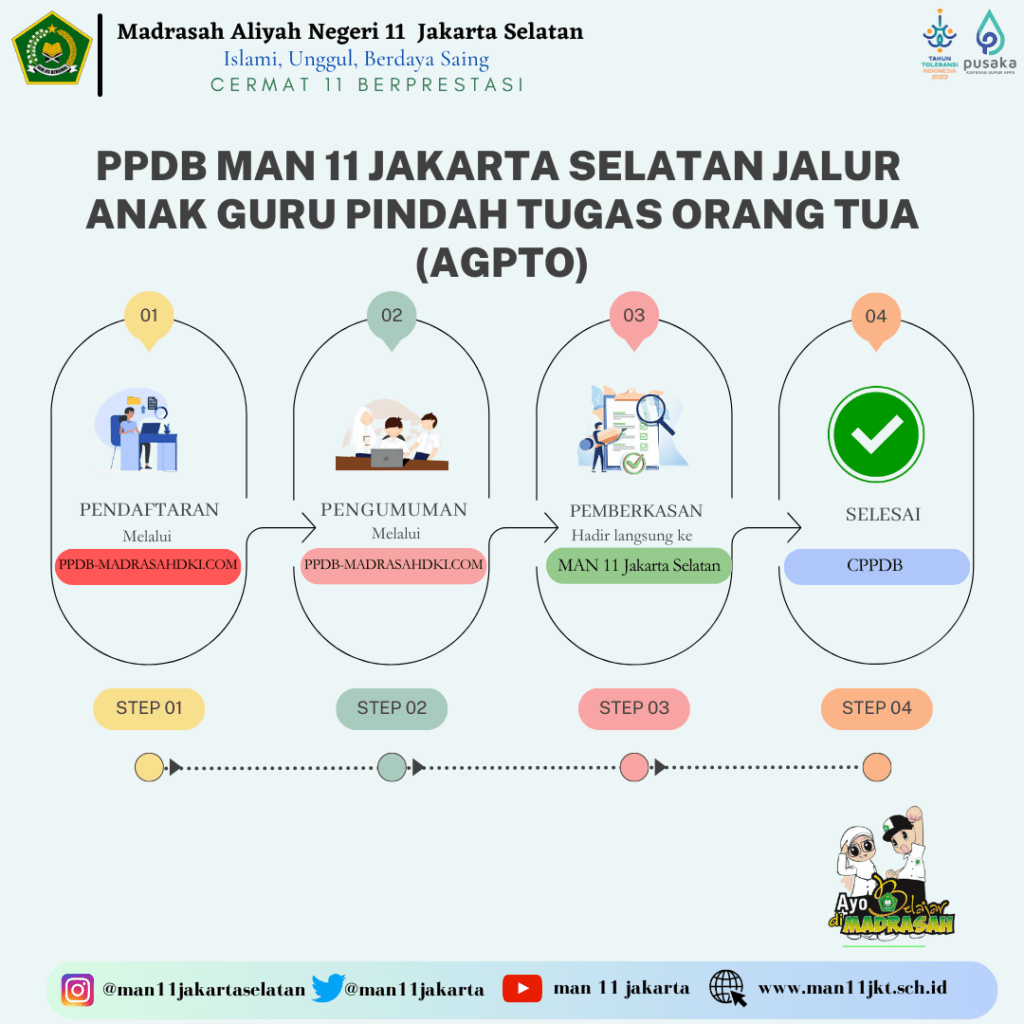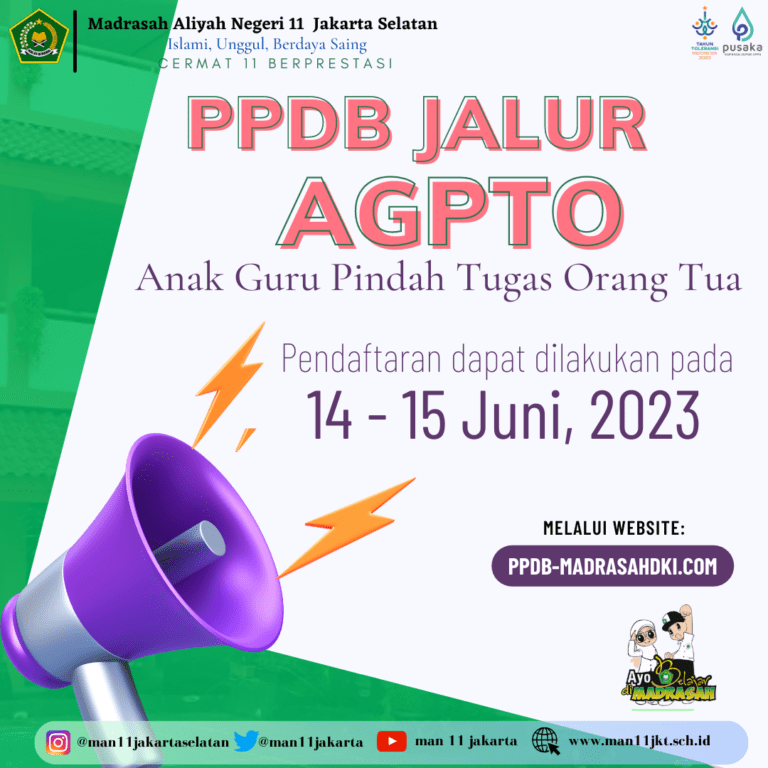 Pendaftaran Penerimaan Peserta Didik Baru (PPDB) MAN 11 Jakarta Selatan jalur Anak Guru Pindah Tugas Orang Tua (AGPTO) mulai dibuka dari tanggal 14 Juni s.d. 15 Juni 2023 melalui website ppdb-madrasahdki.com.