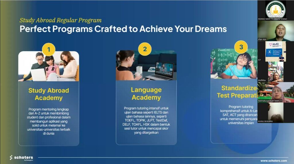 Jakarta (Humas MAN 11 Jakarta) – MAN 11 Jakarta kembali menunjukkan komitmennya dalam mendorong internasionalisasi pendidikan melalui kegiatan Sosialisasi Program Persiapan Studi dan Beasiswa Luar Negeri (PTLN) yang dilaksanakan pada Minggu, 12 Oktober 2025. Kegiatan ini berlangsung secara daring melalui Zoom Meeting dan dihadiri oleh Tim Manajemen Madrasah, Wali Kelas, Tim Bimbingan Konseling, serta para orang tua/wali siswa kelas X dan XI. Acara ini terselenggara atas kerja sama antara MAN 11 Jakarta dengan Schoters, sebuah lembaga konsultan pendidikan global yang telah berpengalaman mendampingi pelajar Indonesia menembus perguruan tinggi ternama dunia.12/10/2025