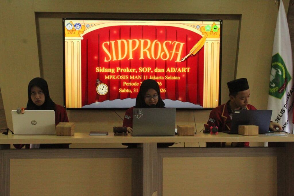 Pelaksanaan Sidang Program Kerja, Standar Operasional Prosedur (SOP), serta Anggaran Dasar dan Anggaran Rumah Tangga (AD/ART) OSIS dan MPK Periode 2025/2026 MAN 11 Jakarta Selatan dilaksanakan pada Jumat (31/01/2026). Kegiatan ini mengusung tema “Penyelarasan Regulasi dan Program Kerja sebagai Fondasi Tata Kelola MPK/OSIS yang Efektif” dan berlangsung secara tatap muka di Aula MAN 11 Jakarta Selatan.